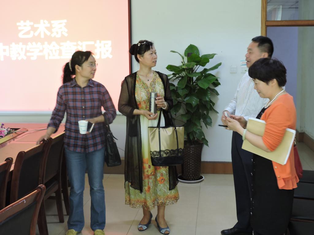 5月11日上午,由制药工程学院副院长李利红、公共外语教研部副主任许海兰、北龙体育教学部副主任高丽三位专家组成的教学检查组,莅临我系开展期中教学检查工作。艺术系主任田秀群代表艺术系对于检查组的到来表示欢迎,教学秘书邵丽娜对艺术系本期教学情况及教学档案建设做了简要汇报,并陪同检查组成员查看了教学档案、教研室环境和学生的作业情况。
