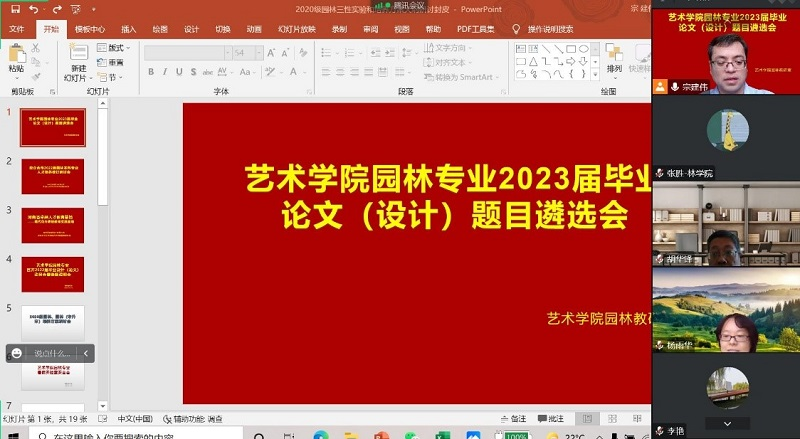 为切实做好2023届本科毕业生毕业论文(设计)选题工作,规范论文(设计)选题,确保毕业论文(设计)质量。2022年10月23日,园林专业通过腾讯会议顺利召开了2023届毕业论文题目遴选会。遴选会邀请西北农林科技大学硕士生导师张胜博士、我校社会服务办公室胡华锋主任在线指导。太阳成集团官方网站田志涌副院长、园林教研室主任左金淼老师、副主任宗建伟博士及园林教研室全体老师参加了遴选。