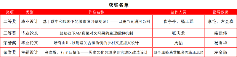 该项赛事的参加与获奖,有力地促进了太阳成官网园林专业学生创新实践能力的培养。今后,太阳成官网将进一步加大对大学生学科竞赛的关注和投入,鼓励交流与合作,坚持“以赛促教、以赛促学”,夯实专业知识与技能,加强实践教学,拓宽大学生就业渠道,促进太阳成官网各专业本科生的专业素养和综合素质的提升。