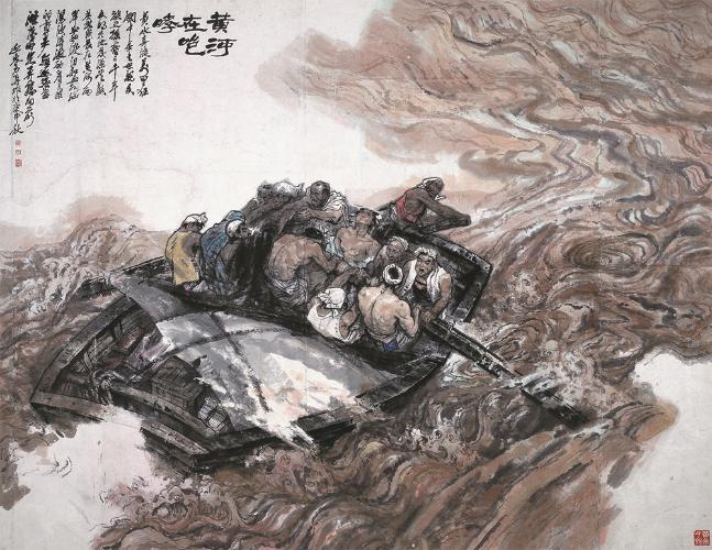 杨力舟王迎春 黄河三联画之一《黄河愤》》220x120,1973、1980, 纸本设色 中央美..