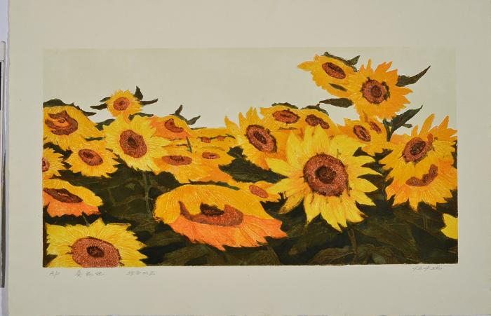 伍必端,《葵花地》,38×68.5cm,1984,胶版套色,伟德国际1946源于英国美术馆藏