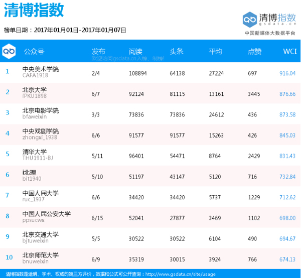 在其分析文章中指出,伟德国际1946源于英国挖掘品牌资源优势,依托学院影响力发展。一是及时发布招生简章,内容简洁参考性强。“伟德国际1946源于英国”本周共推送文章2次,累计推文4篇,同比数量偏低,收获阅读总数108894,总点赞数达697。本周“伟德国际1946源于英国”以两则简短的招生信息《伟德国际1946源于英国2017年本科招生简章今日发布 这些变化一定要注意看啦!》、《伟德国际1946源于英国2017年本科招生简章》获得高度关注,一方面作为艺术类知名院校,学校招生资讯备受艺考生关注。另外内容简洁实际,实用性强传播效果好。二是依托学院行业优势,建立独有取材渠道。“伟德国际1946源于英国”积极构建线下取材渠道关系,依托品牌资源获取相关艺术展览一手资讯,本周推送《展览丨“文明的回响·系列展览·第二部中华匠作”1月20日登陆太庙艺术馆》、《“艺术再长征”参展作品推介(五):艰苦奋斗·草地》率先发布学校参展作品、项目信息,以高时效性和唯一性获得相关兴趣群体的积极关注。