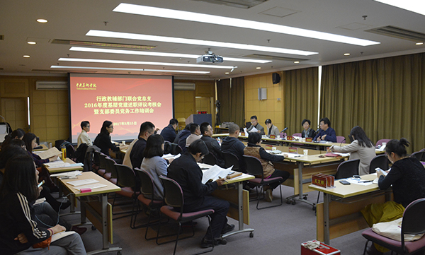 3月15日下午,行政教辅部门联合党总支在图书馆报告厅举行2016年度基层党建述职评议考核暨支部委员党务工作培训会。党委副书记兼纪委书记孙红培、党委组织部部长许娟、纪委办公室主任刘娟出席会议,行政教辅部门11个党支部的书记、委员和代表参加会议。会议由行政教辅部门联合党总支书记潘承辉、副书记金日龙主持。