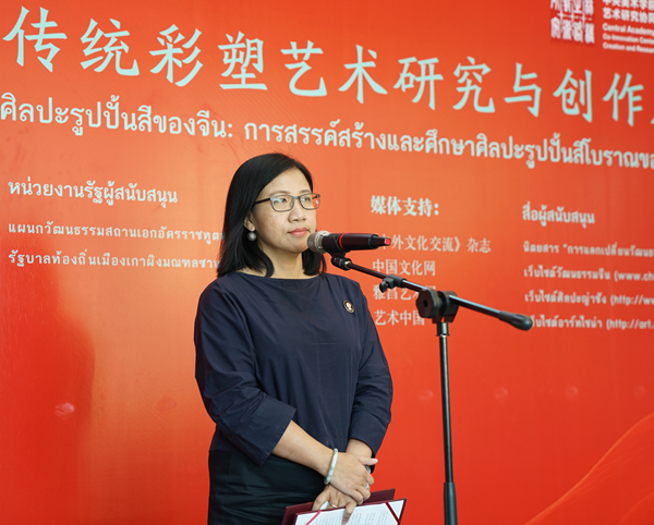 泰国国家美术馆馆长妮塔雅·甘葛梦致辞中介绍了中国学界在汉代说唱俑和秦始皇兵马俑方面的最新考古发现,及其体现出的对中国传统文化的持续关注。她认为,包括此次展览的举办,都给了泰国文化艺术界以启发,推动大家关注本民族文化的传承保护,并展开新的研究与思考。