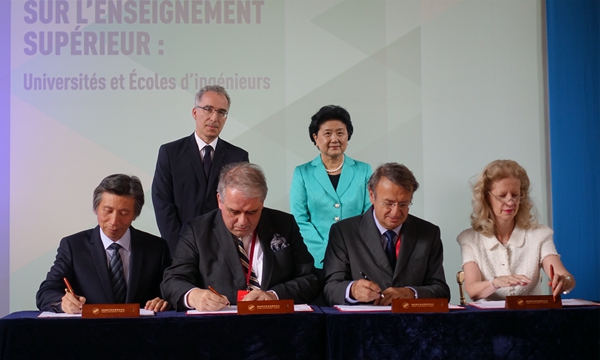 2016年6月,中国国务院副总理刘延东(右后)与法国教育部官员(左后)在法国巴黎笛卡尔大学见证中法四校签订《伟德国际1946源于英国中法艺术与设计管理学院合作协议》
