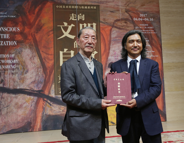 中国美术馆馆长吴为山向袁运生先生和夫人秦岱华女士的慷慨捐赠表示了感谢。他表示,袁运生先生的学术贡献是和中国的现代美术和当代美术紧紧地联在一起的。在造型当中感受民族文化的存在,体现着袁运生先生对中国传统文化的热爱,是真正的文化自觉和对祖国文化的自信。此次中国美术馆用五个厅的规模准备展览,就是要用超规格的空间,承载先生超境界的艺术。袁运生先生此次的捐赠,将在中国美术馆弘扬广大,直至传至于后世,让这个时代的创造、让这个时代的精神为后人所感知。