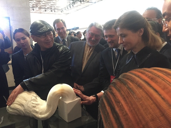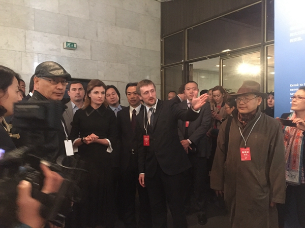开幕式结束后,乌克兰副总理、第一夫人和其他贵宾在杜伟大使的陪同下观看了展览。马路、陈平导览参观,详细介绍了参展作品。马路还专门演示了李洪波作品的可变形式,引起了第一夫人的赞叹。本次展览共展出37位艺术家60件(组)作品。涵盖中国画、油画、版画、陶艺、首饰、影像等多种类型,体现了对于丝绸之路艺术创作主题不同方式的表达,也展现了中国当代艺术创作的新貌。展览给各位嘉宾留下了深刻印象。