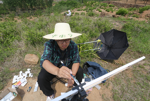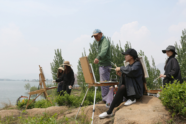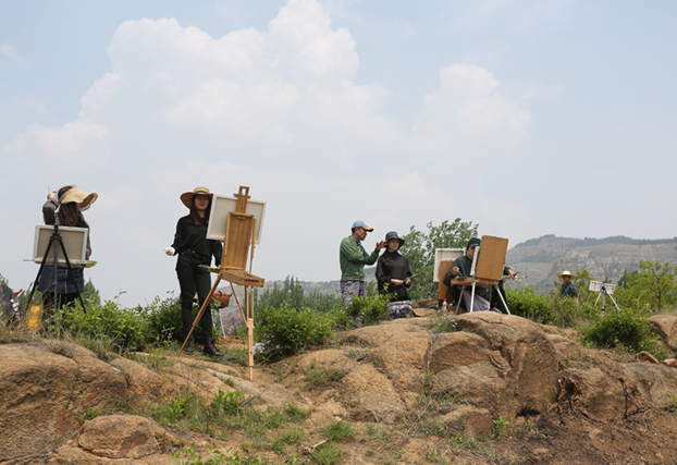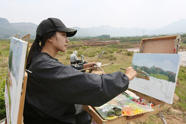 蓝天白云,远山近水,偶见北方特有的那种裸露的黄土,支着画家专注于写生的几位同学,落落有致地进入画面。 “南北方的景色完全不同,南方的山水可以说秀美,北方的风景,更开阔。”来自江南的朱紫薇说很喜欢北方多了些黄土气息的壮美。