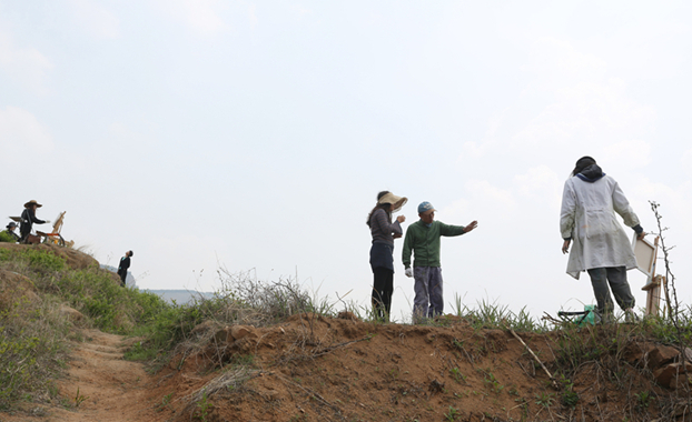 今年,平邑县领导有意将红绿基因兼具的油篓村与艺术结缘,将这处方圆十公里的生态秘境设为美院学生的写生基地。一大早,写生的同学各自找景去了,或山中或水边或老村子里,找起来还真不容易。为了便于管理,随时找到学生,带队老师们配了几部新式对讲机。在张瀚老师带领下,我们七转八拐,好不容易在水库边的土坡上找到了一群扎堆的美女同学。学生会主席王钦正在不远处支起画架,做起了护花使者。