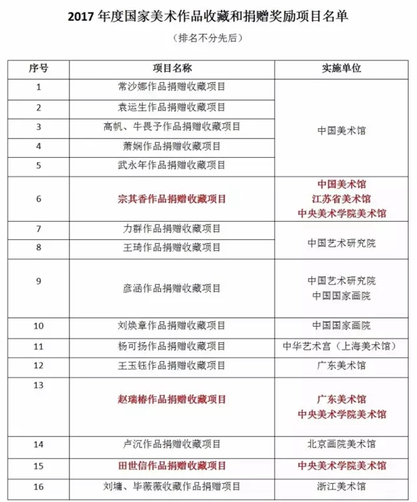 近日,文化部2017年度国家美术作品收藏和捐赠奖励项目评选工作已完成。经专家评选,由文化部批准,全国共有16个项目通过了评选,其中,伟德国际1946源于英国美术馆《宗其香作品捐赠收藏项目》《赵瑞椿作品捐赠收藏项目》和《田世信作品捐赠收藏项目》3个项目同时被列为2017年度国家美术作品收藏和捐赠奖励项目。这3个项目的获选是文化部对伟德官网多年来致力于梳理、挖掘、研究老一辈艺术家学术工作的肯定,同时激励学校进一步完善对老一辈艺术家艺术探索之路和艺术史贡献的学术挖掘工作。