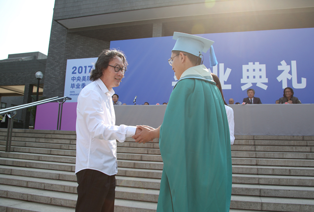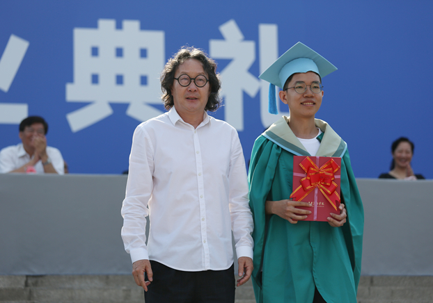 学术委员会主任徐冰教授为获得今年“千里行奖”的设计学院本科毕业生苏永健颁发获奖证书