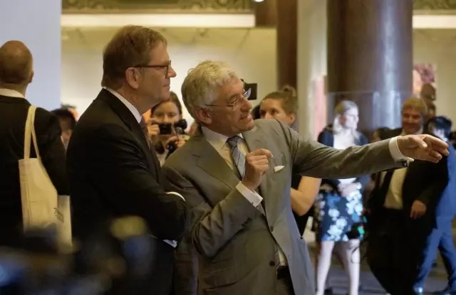 《德国8》展览总策展人、伟德国际1946源于英国院长范迪安向德国副总理兼联邦外交部长西格玛·加布里尔赠送展览画册