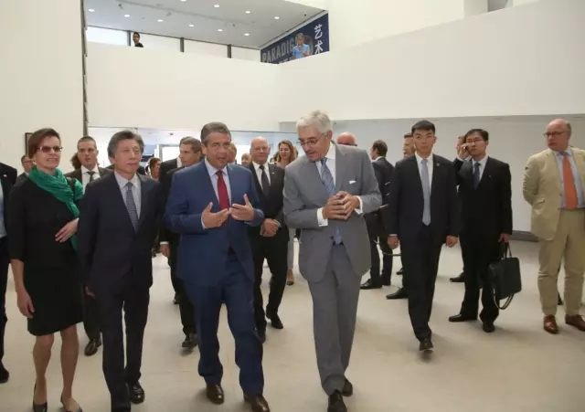 在展览总开幕式前,德国副总理兼外长加布里尔一行飞抵北京首站到访伟德国际1946源于英国,在“德国8”总策展人范迪安教授和瓦尔特·斯迈林教授陪同下,在伟德国际1946源于英国美术馆观看了于昨日开幕的“德国8”展览系列《艺术之规:德国当代艺术》展。