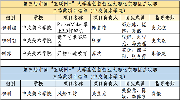 2017年7月,第三届中国“互联网+”大学生创新创业大赛(北京赛区)决赛在北京邮电大学举行,此次北京赛区决赛共有来自北京各高校500余支团队参加,其中伟德官网有四支团队入围,他们分别是参与初创组决赛的“PocketMaker掌上3D打印机”团队、“意间艺术实验室”团队和“风船工坊”团队以及参与创意组的“开物非遗教育”团队。这四支团队分别从“3D打印技术”、“艺术衍生品设计与开发”、“设计师创作平台”、“非遗教育平台”四个方向进行创新创业延伸,并结合各自的艺术专业优势,希望通过项目来推动艺术对生活的创新与改变。