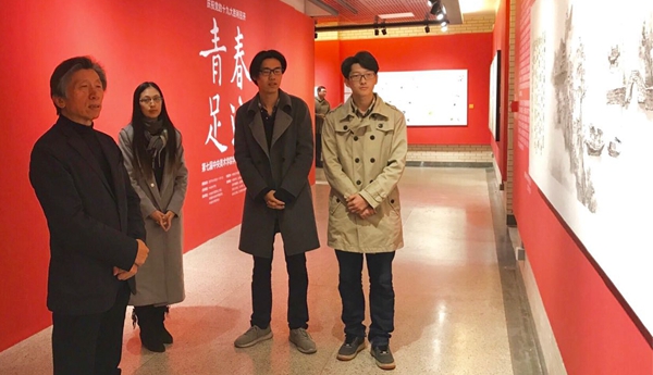 2017年11月7日中午,范迪安院长专程来到5号楼旋转展厅观看了第七届“青春•足迹”学生主题创作展,并亲切勉励获奖学生代表。