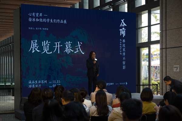 2017年11月11日,“雁渡寒潭不留影——徐冰和他的学生们作品展”在诚品生活苏州开幕。此次展览由诚品生活苏州主办,木石应言文化艺术有限公司承办,由段少锋、杨梦娇联合策展。展览邀请艺术家徐冰和他的15位学生,联合展示26组各自艺术生涯中的代表作品,涵盖绘画、装置和影像等多种表现手法,徐冰师生透过作品形态进行对话,诠释师生间的“心有灵犀”。展览由两部分组成,第一单元为艺术家徐冰创作中与书籍和教育相关的作品及文献,第二部分“心有灵犀”为徐冰硕士博士作品展。