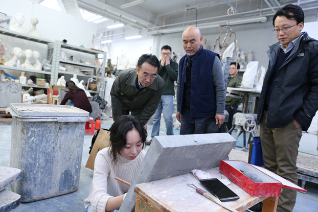 检查组走访了中国画学院、造型学院油画系、造型学院雕塑系、造型学院壁画系、设计学院、建筑学院,考察了安全保卫中控室、保密办公室、网络信息中心、教工之家、学生活动中心、民主党派活动室、思想政治理论课课堂、心理咨询中心、就业指导室、学生食堂、学生自习室、学生宿舍等。