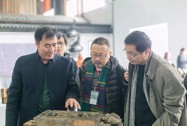 浙江东阳卢宅营造技艺传承人吕雄心为参会专家介绍展品详情
