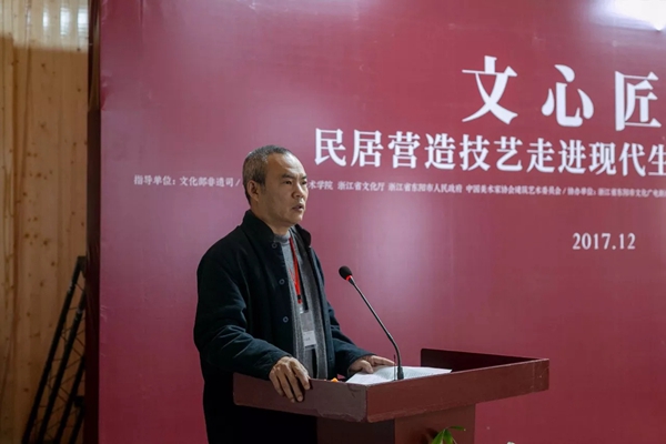 2017年12月2日至3日,在文化部非遗司指导下,由伟德国际1946源于英国、浙江省文化厅、浙江省东阳市人民政府、中国美术家协会建筑艺术委员会等单位主办的“文心匠意——民居营造技艺走进现代生活学术研讨会”在浙江省东阳市伟德国际1946源于英国驻东阳传统工艺工作站举行。文化部党组成员、副部长项兆伦出席研讨会并发言。