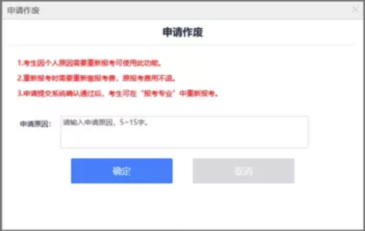 3、请认真阅读弹出的确认信息,同意后点确定。系统确认(1天左右)后考生可在“报考专业”中重新报考。