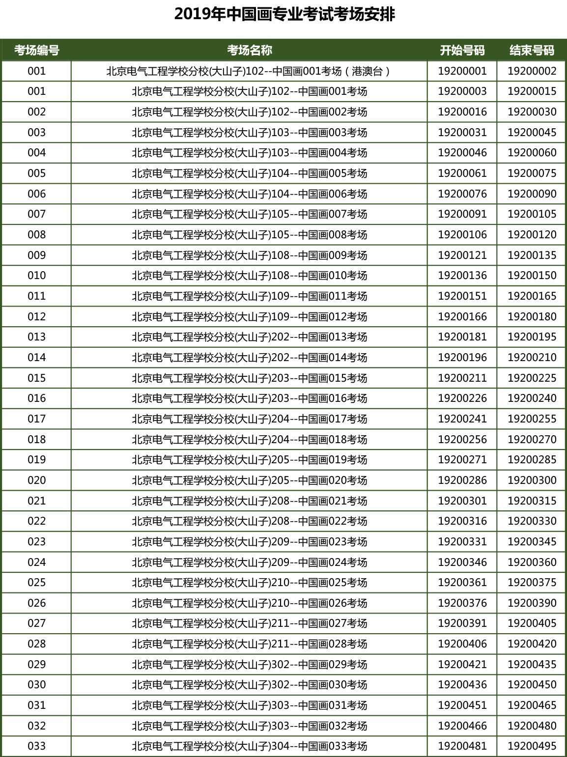2019年中国画、书法学、实验艺术专业考试考场安排
