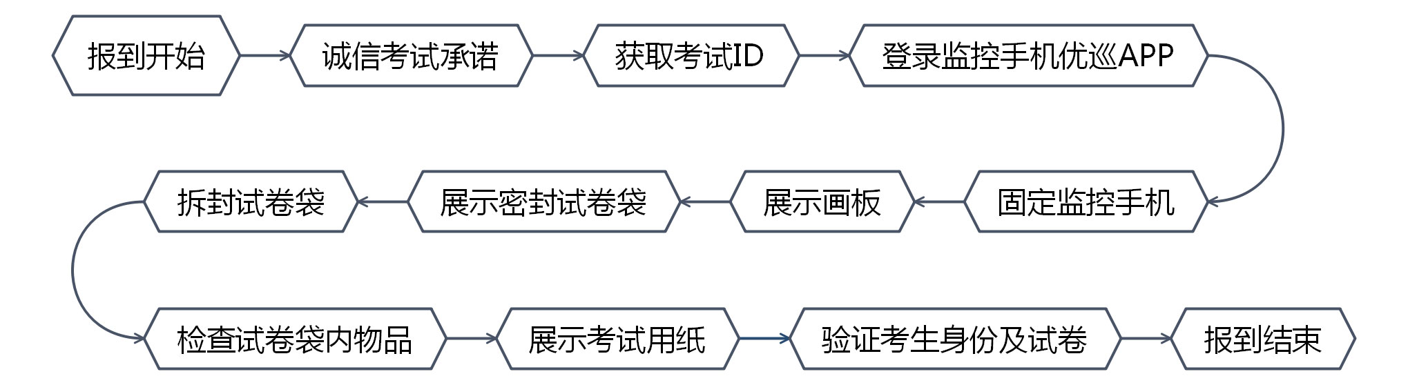 距离考试开始15分钟时开始报到,考试开始后15分钟停止报到。报到流程如下: