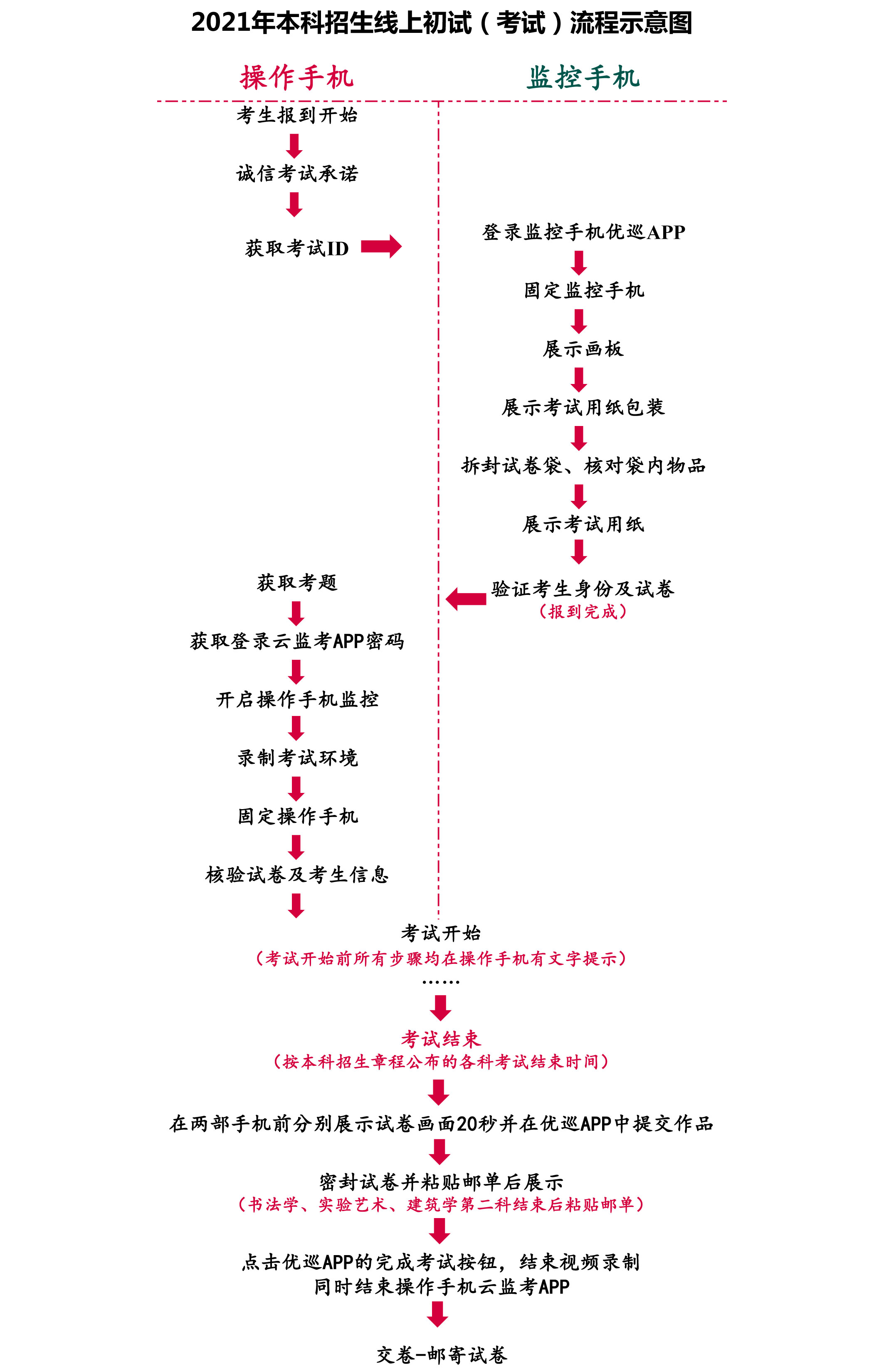 开考前5分钟公布考题,考生通过操作手机在招生系统中获取。监控手机优巡APP界面可显示考题内容,方便考生查看;如有需要,考生可用铅笔将考题抄在试卷上,考试结束前须擦除。