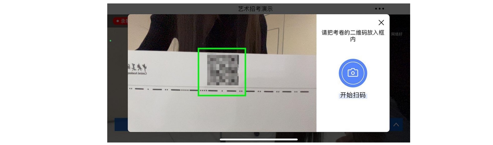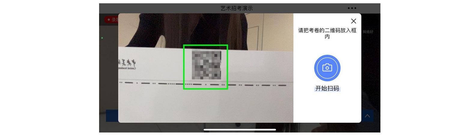 试卷二维码验证:考生按要求将试卷上的二维码对准界面提示框,点击屏幕右侧的“开始扫码”按钮进行验证(自行准备考试用纸的考生可跳过此步骤)。