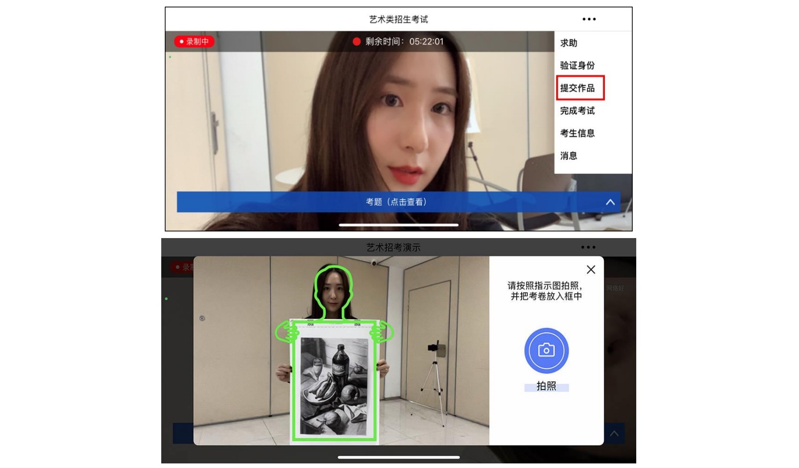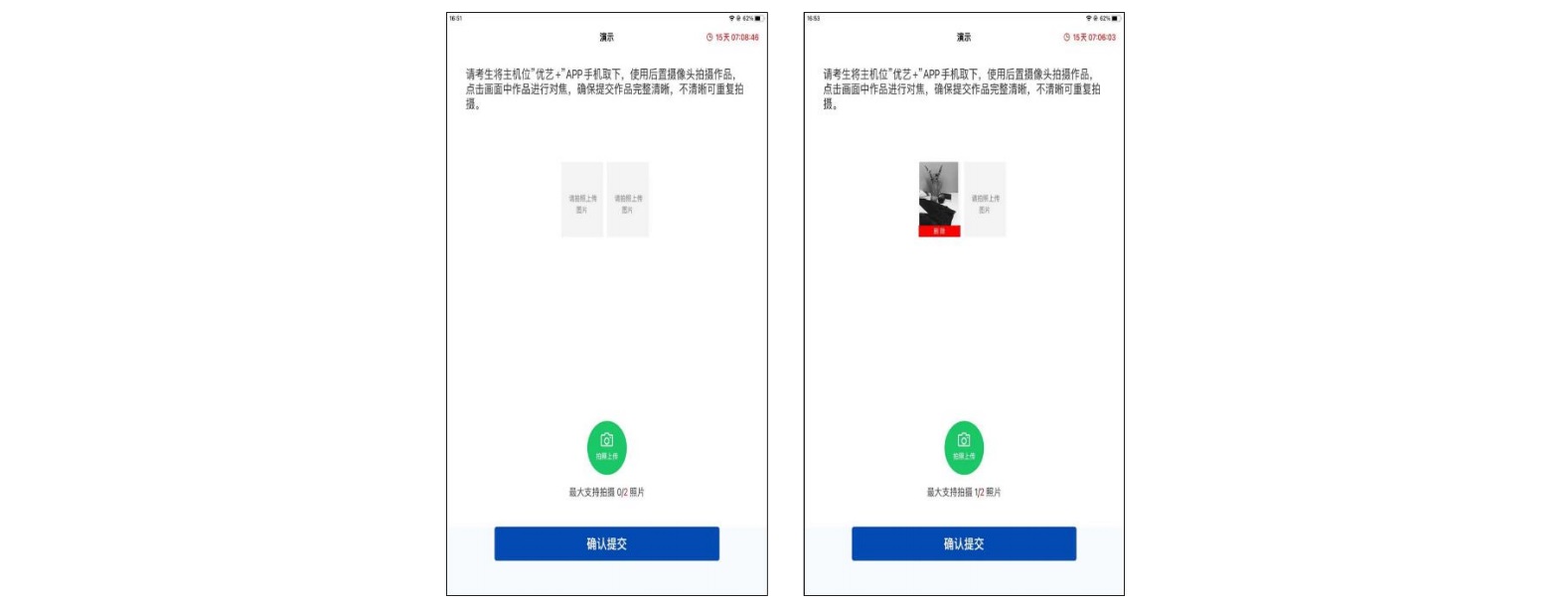 2.考生点击界面相机开启作品拍照,将作品按图示框示意进行拍照,不得拍摄过多环境,仅拍作品本身,不满意可删除重新拍照,清晰满意后点击“确认提交”进行作品提交。