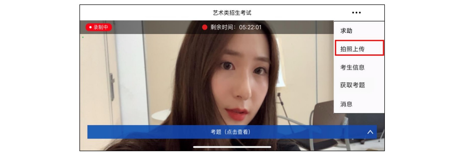 2. 提交作品:考生点击“优巡”APP界面右上角“…”中“提交作品”按钮,按界面图文框提示,点击“拍照”按钮,请保持定格静止不动,倒计时10秒自动拍摄。