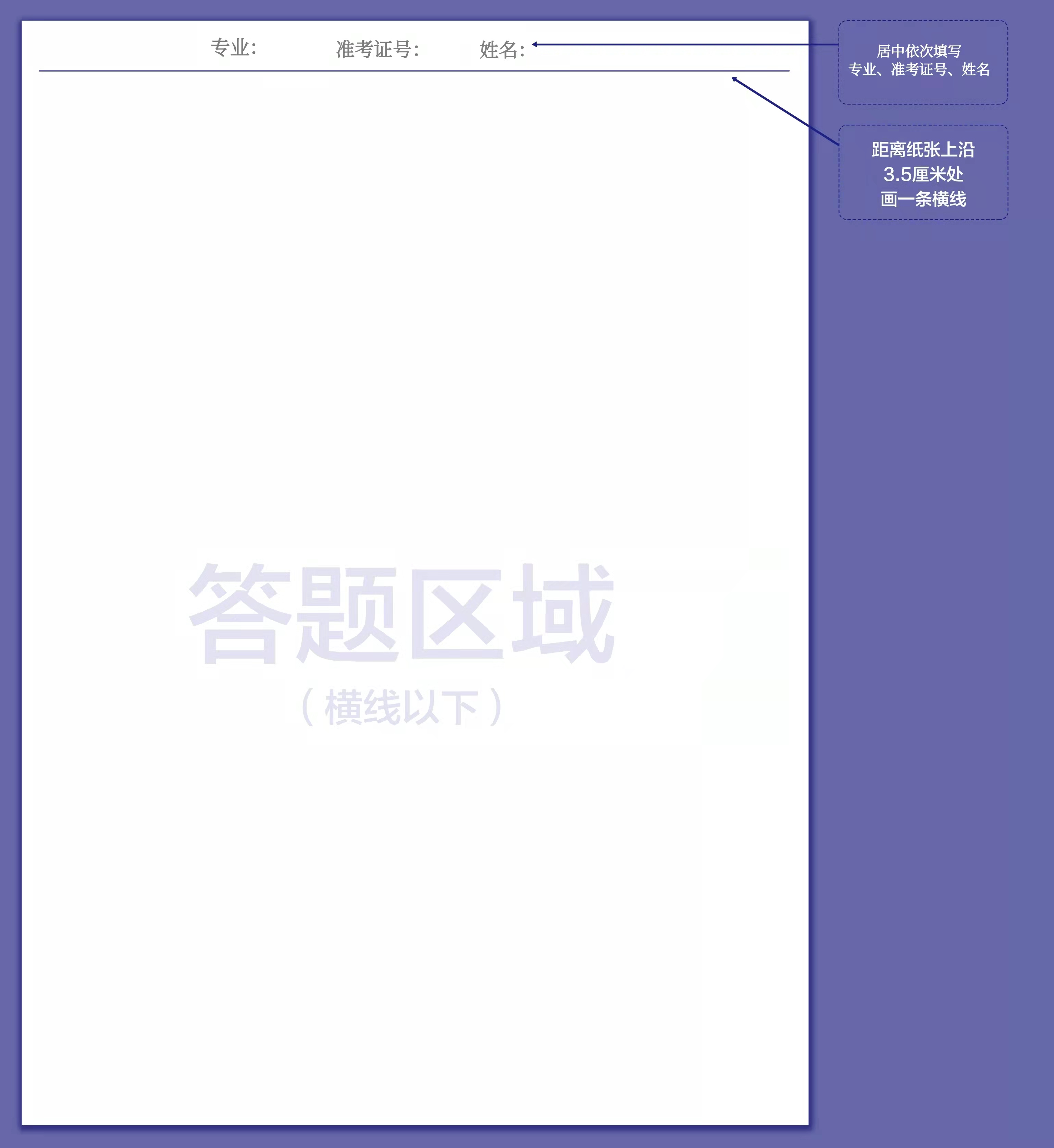 2.请考生在考试用纸边距较窄的一端距离边缘3.5cm处画一道横线,区分卷头和答题区域,并在在横线上面区域居中写明专业、准考证号和姓名。示意图如下: