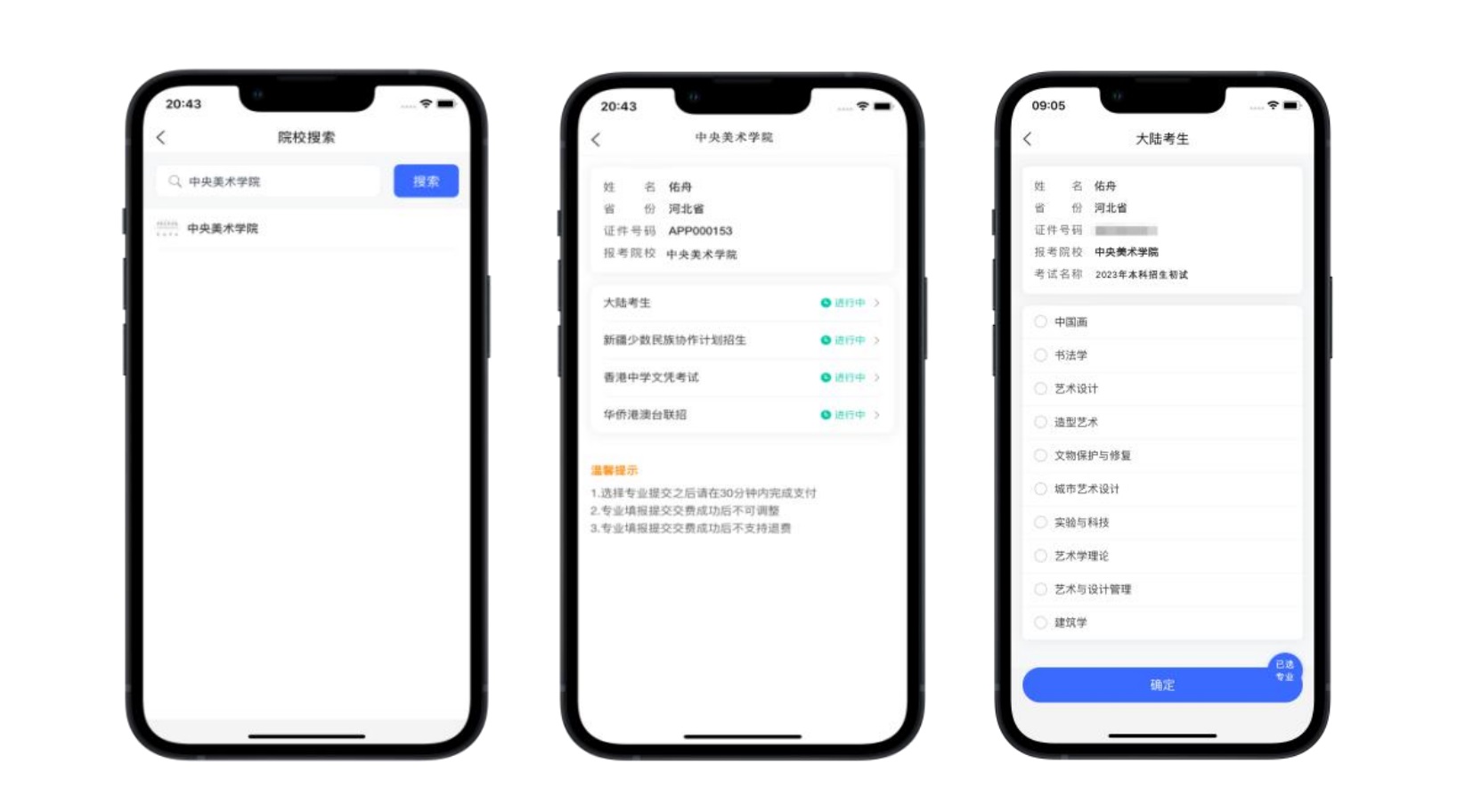 请考生在【上传报考资料】页面关注审核结果,若审核未通过,考生需按要求重新上传。报考资料审核通过后方可进行“报考类别和专业”选择。