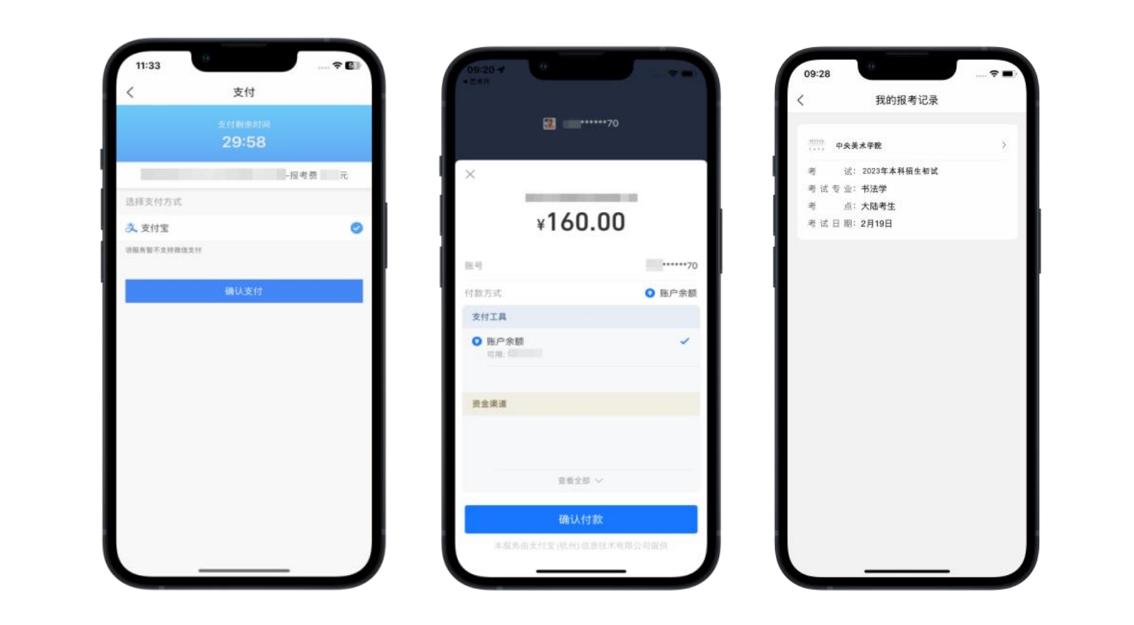 考生提交报考信息后,应在30分钟之内通过支付宝完成网上交费。交费成功的考生可在报考页面【报考记录】中查看报考信息。