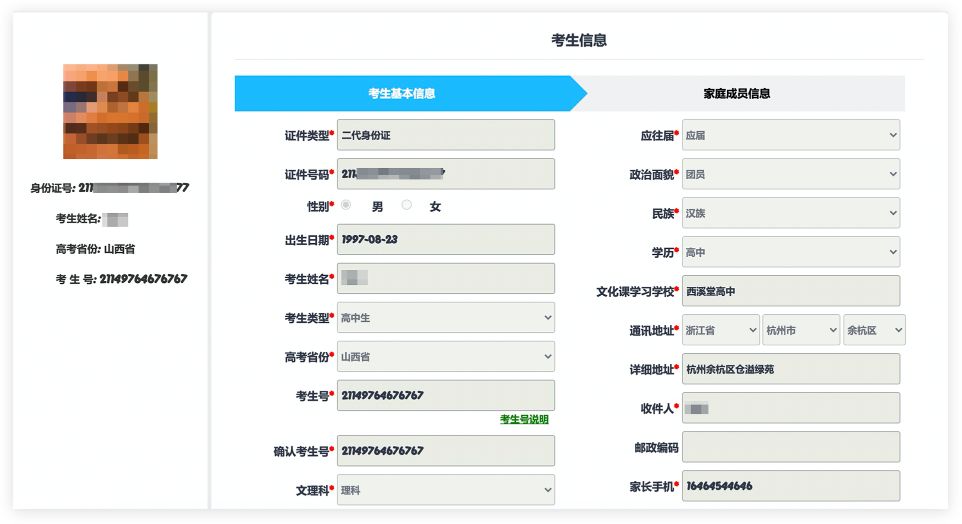 考生根据实际情况认真填写考生基本信息及家庭成员信息,确认无误后再点击【提交】,信息提交后不可更改。