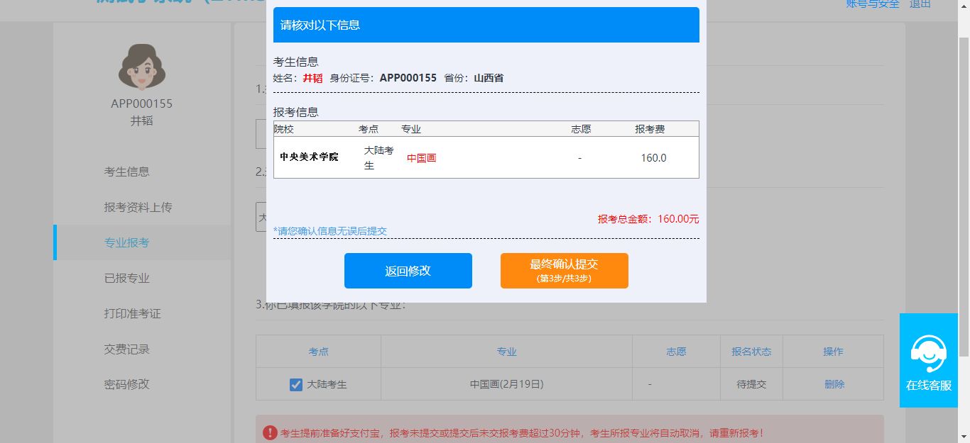 考生应严格遵守诚信考试原则,真实、准确填写报考信息,并在交费前认真核对所选择报考的专业,确认无误后再进行交费,报名费:160元/人。报考信息一经确认,不可更改。因考生选择失误造成的后果,由考生本人承担。