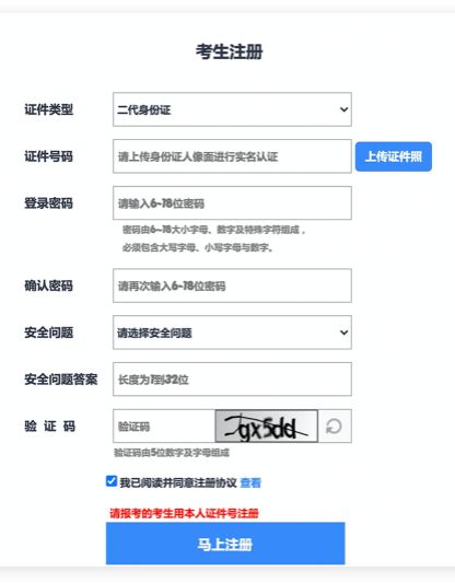 考生注册时需要输入证件号码、系统密码和安全问题(安全问题答案在考生忘记密码时可以用来重新设置密码),信息确认无误后点击【马上注册】。