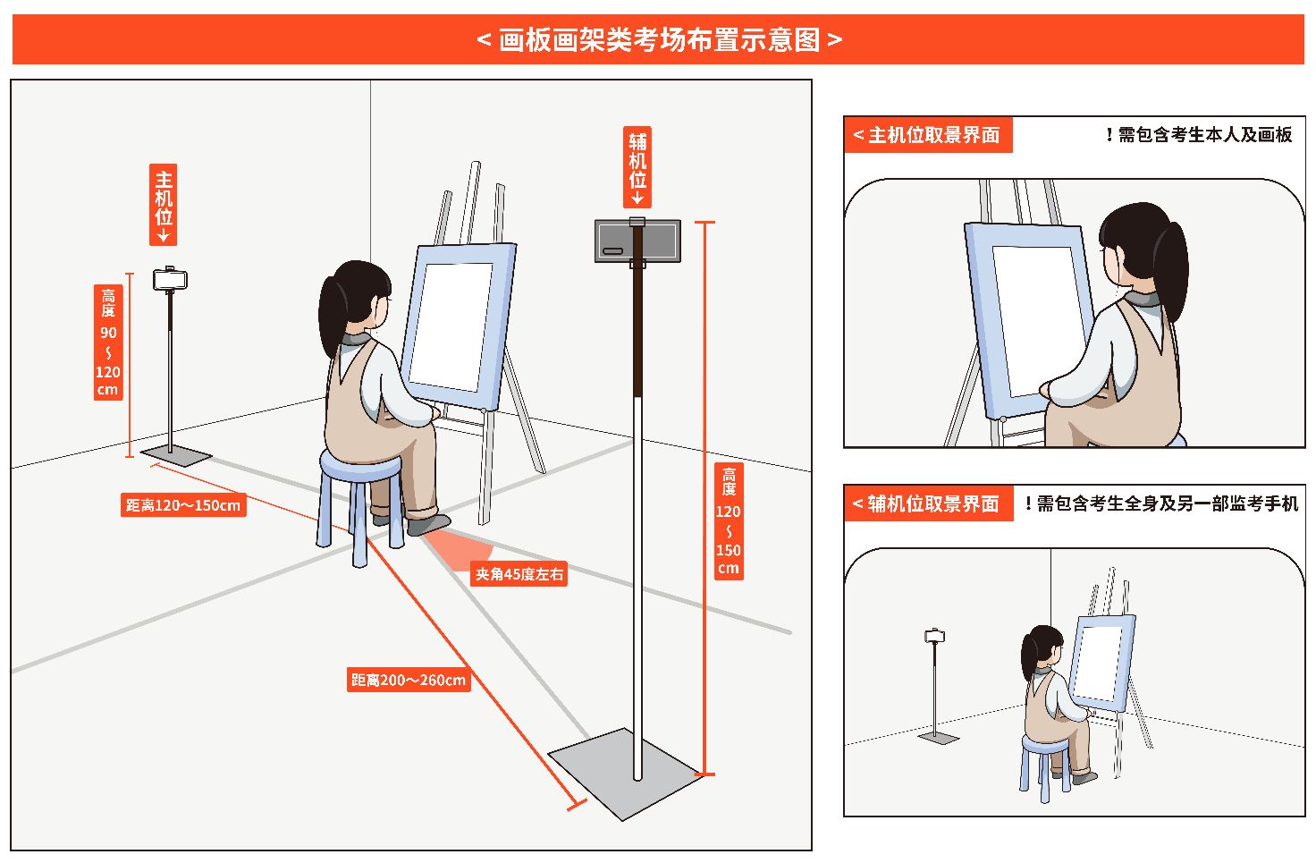考生须面向墙壁放置画板、画架或桌椅,墙壁不得带有转角,不得故意设置监考盲区。考生须按下列图示要求布置考场,提前调试拍摄距离和光源,确保2部手机的录制画面清晰,录制界面与图示取景界面一致。