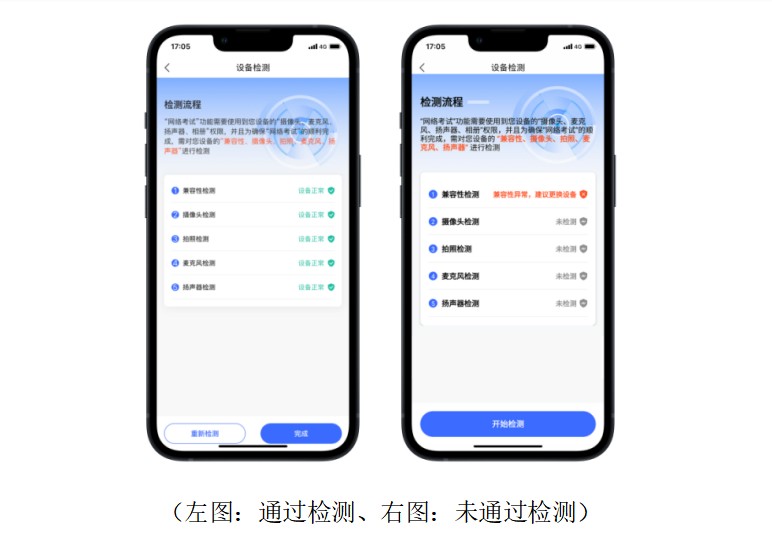 2.设备检测:考生在第一次打开“艺术升”APP时,一定要允许应用访问摄像头、麦克风、扬声器、存储空间、网络等权限。对设备的“兼容性、摄像头、拍照、麦克风、扬声器”进行检测,通过检测的手机方可用于参加考前测试和正式考试;兼容性异常或出现部分检测项未通过的手机无法支持考试。
