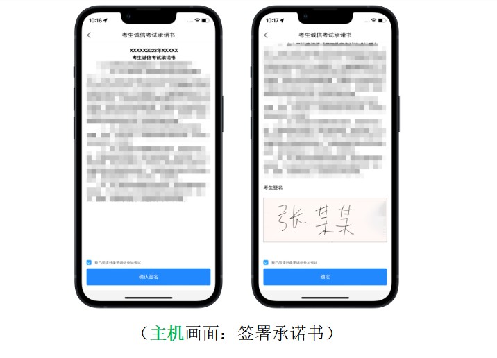 辅机正常进入直播考场后,主机自动弹出《考生诚信考试承诺书》,请考生仔细阅读,确认无误,勾选【我已阅读并承诺诚信参加考试】,并在手机上签字确认。