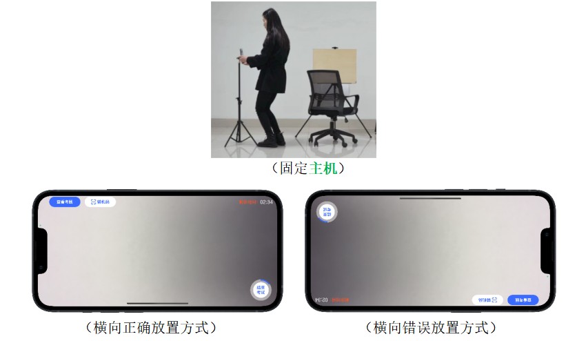 四、主机固定:考生完成考场环境展示后将主机横向固定在主机位手机支架上。