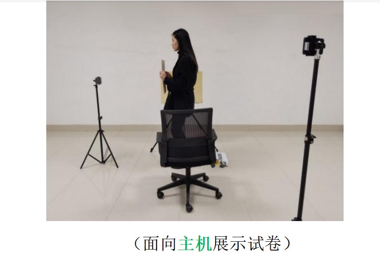 请考生根据语音指令,以答题位置为中心缓慢移动,将主机放置于胸前,360度展示考场环境。再依次展示天花板、地面、画架或桌面。