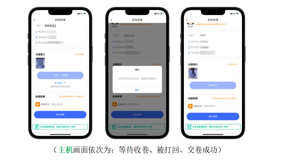 2.请考生关注收卷状态,试卷照片不完整或不清晰将会被监考员打回,考生须重新拍摄,重新点击【交卷】,直至交卷成功。交卷过程须在辅机监控下进行。
