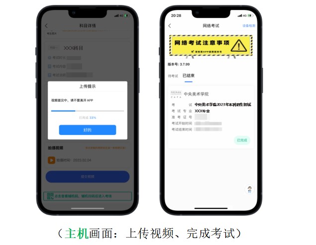 考生完成试卷封装展示后,在主机点击【提交视频】按系统提示时间提交本地录制的考试视频。视频上传成功前,请勿退出艺术升APP,切忌卸载!