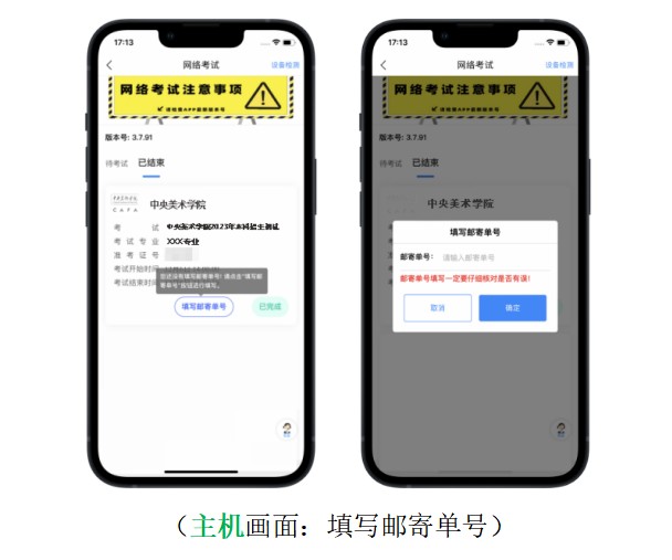 考生按要求将试卷通过中国邮政特快专递寄出后,登录主机“艺术升”APP,点击【网络考试】,选择对应考试【填写邮寄单号】。确保输入的邮寄单号无误后再点击【确定】。至此,当科考试所有步骤均已完成。