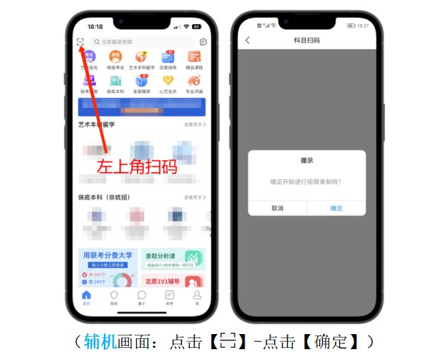 2.辅机扫码:使用辅机打开“艺术升”APP(无需登录账号),点击【首页】左上角扫描功能按钮,扫描主机页面显示的二维码直接进入直播考场,将辅机固定在辅机位手机支架上。若辅机未成功进入监控状态,则无法进行考试。