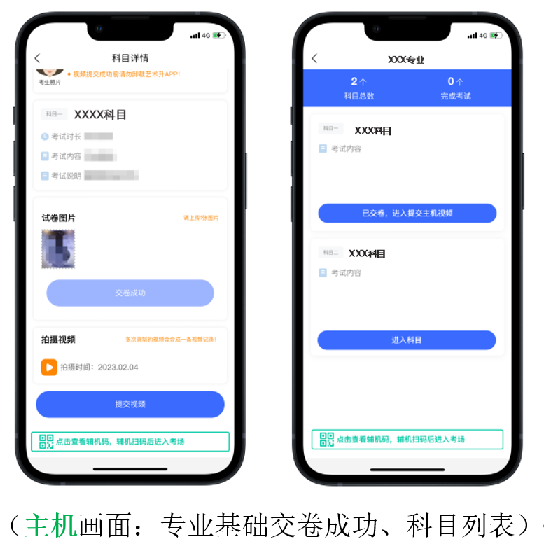 一、艺术学理论类:专业基础科目考试结束后,辅机保持监控状态,直接点击主机左上角返回科目列表,选择综合素质考核科目,点击【进入科目】候考,考题在考试开始前5分钟通过主机公布,考生根据题目进行陈述。10分钟考试结束后主机自动结束录制,返回科目详情页【提交视频】。