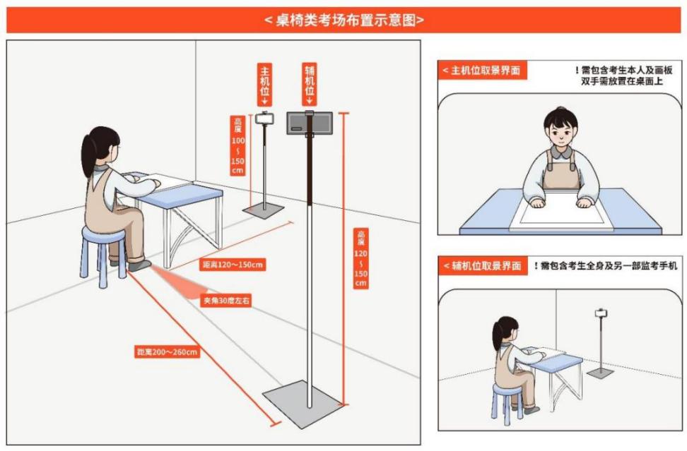 (一)使用画板、画架考场:主机位于考生侧方,辅机位于主机位对侧的侧后方。主机位:考生全身、画板及试卷全部可见;辅机位(全景视角):考生全身、脚部地面、画板画架、试卷全部可见。