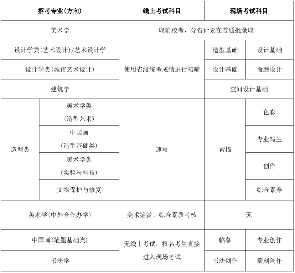 1.造型类专业《速写》科目、美术学(中外合作办学)专业《美术鉴赏》《综合素质考核》科目采用线上考试进行。《速写》科目考试时长为2小时。