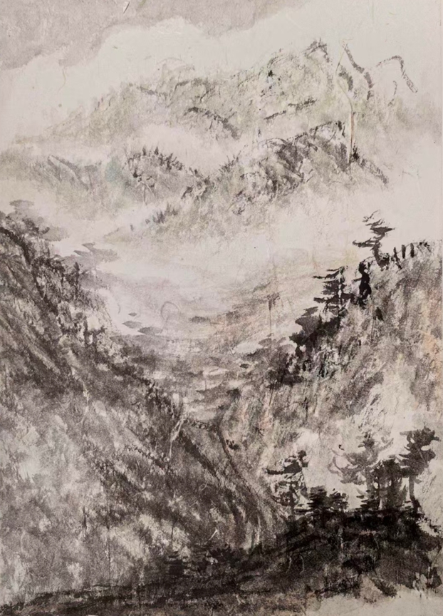 笔墨是中国画的根基,法度是精神的容器。中国画的根基在笔墨与法度,它们不仅是技法的延续,更是生命的象征。“道法古”板块中,同学们从山水、花鸟、人物等传统题材出发,承载着千年文化积淀,学生们通过学习与再创作,继承前人的技艺,赋予传统新的生命。作品中的笔墨力量和古典气息,不只是对过去的传承,更是对精神内涵的再生与升华。