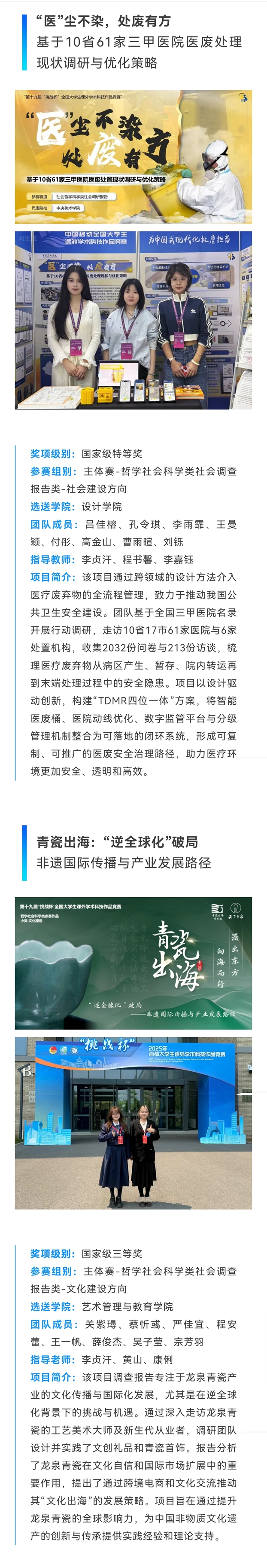 本届国赛是伟德国际1946源于英国参赛以来,首次登上国赛“现场赛”舞台。经过激烈角逐,设计学院选送的《“医”尘不染,处废有方》项目得到评审专家的高度认可,斩获赛事最高荣誉特等奖,实现了首次入围,即获最高奖项,是学校在该赛事获奖成绩上的重大突破。艺术管理与教育学院选送的《青瓷出海》项目获得三等奖。